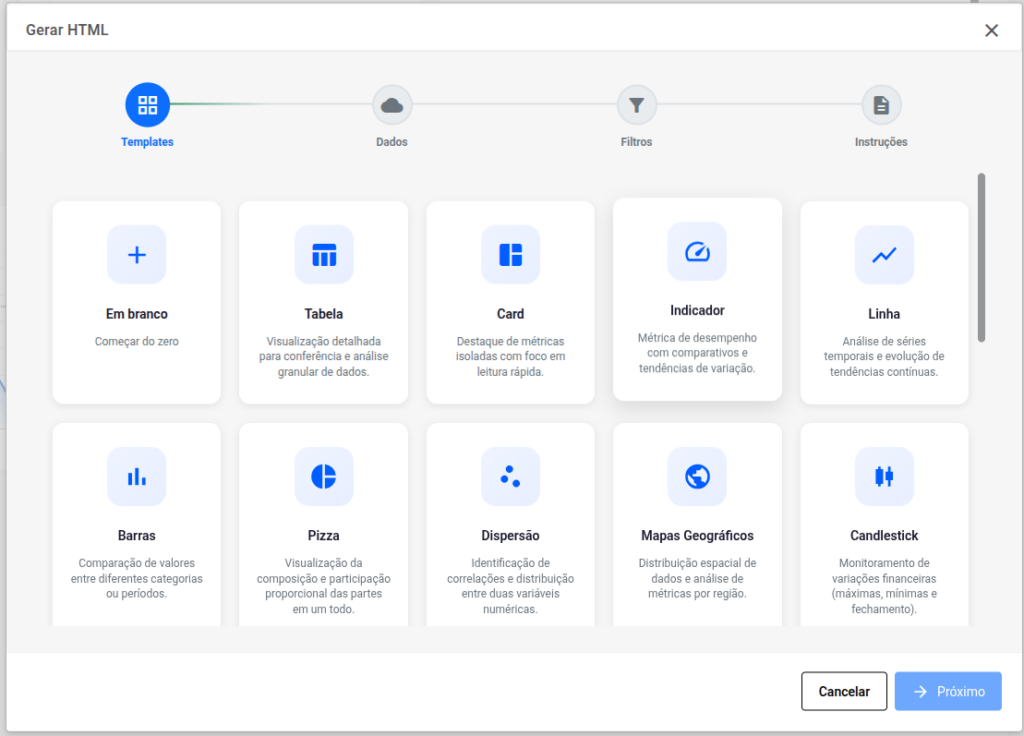 Um assistente inteligente que guia você na criação de componentes HTML dentro dos dashboards. Ele permite gerar códigos complexos, tabelas personalizadas e elementos visuais apenas descrevendo o que você deseja, sem precisar ser um especialista em programação.