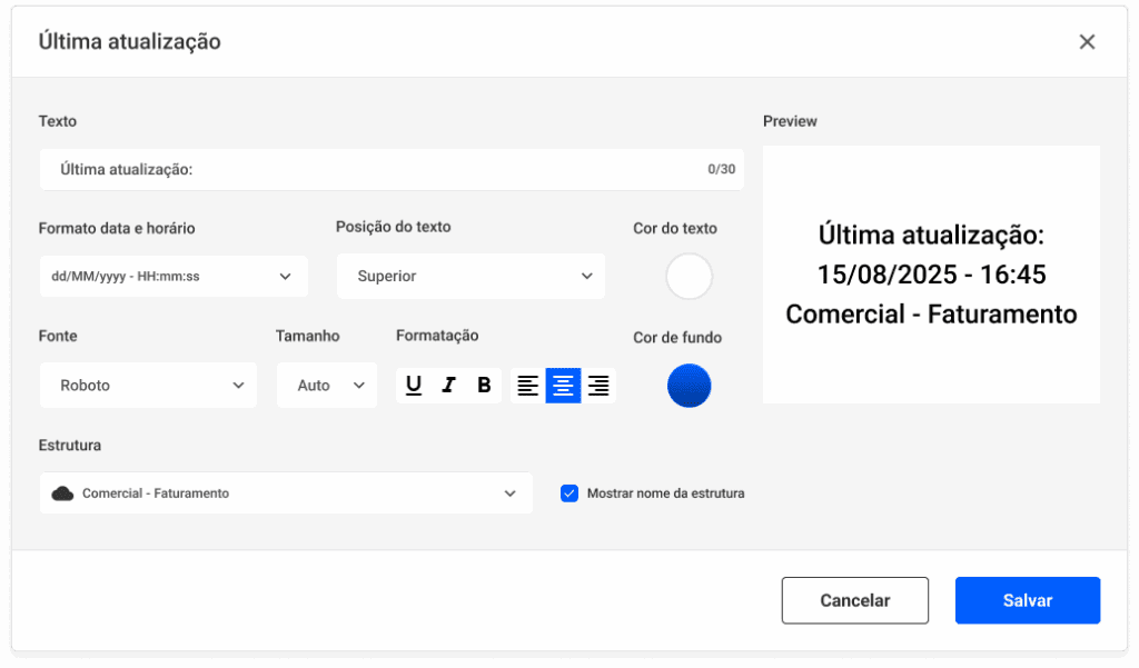 Visualize no dashboard a data e o horário da última carga realizada em uma estrutura.
