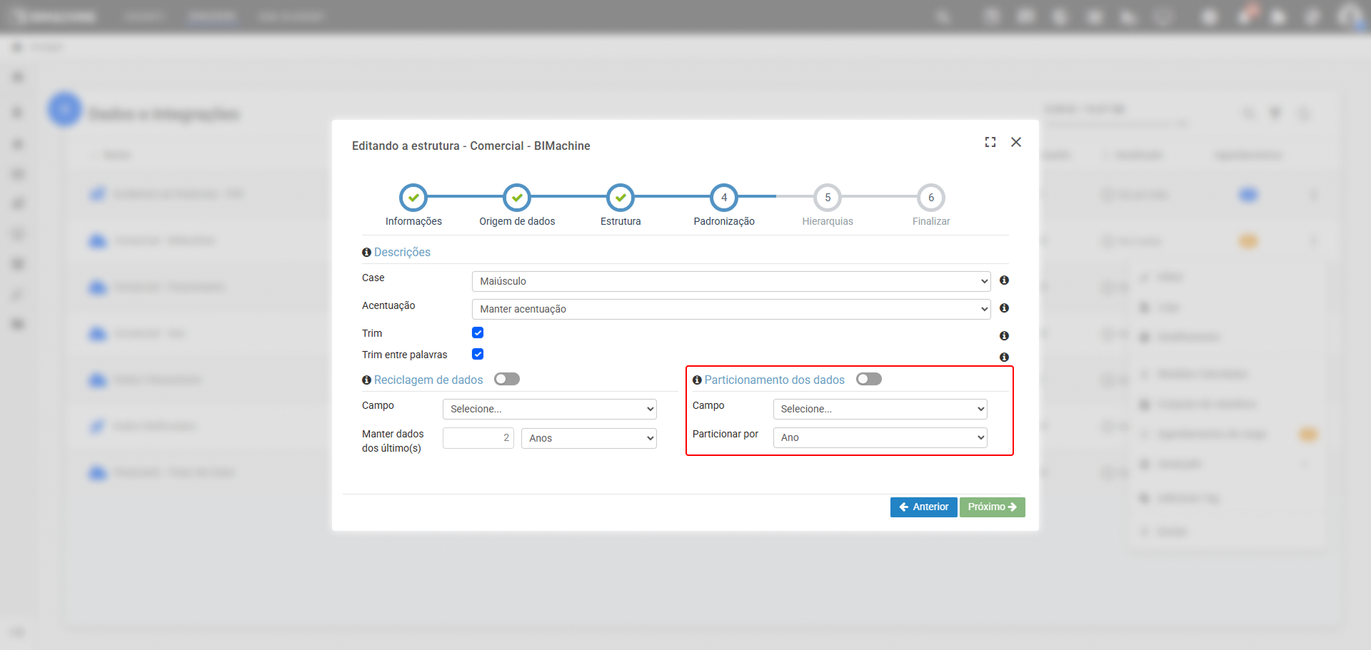 Ao configurar uma estrutura no BIMachine, é possível definir um campo de particionamento, relacionado a períodos de tempo, como ano ou mês.